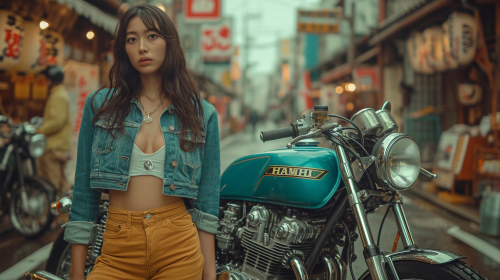 a whole total body photo, a 23-year-old Japanese woman with shirt hair, captured in the style of Daido Moriyama, standing with a vintage racing motorcycle that is fully visible in the frame. The motorcycle shines in a vibrant aqua blue,The entire scene is captured in 4K resolution with a Leica Q3 camera --ar 16:9 --stylize 700 --v 6.0