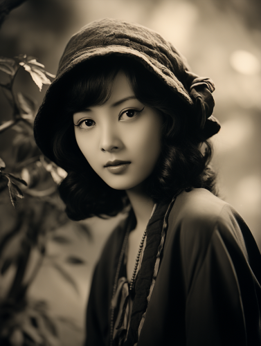 close-up portrait, 1930s Japanese top movie actress, 25yo, beautiful, ethereal, classical cap, B&W vintage photo, cinematic lighting, hyper-realistic snapshot photography --ar 3:4 --s 250 --style raw