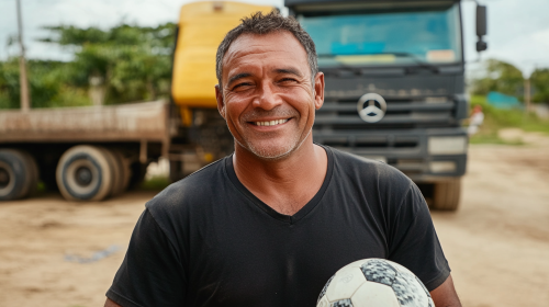 50 years old brazilian men smiling standing looking forward at a camera, full body, playing soccer, wearing black shirt, background of Mercedes-Benz trucks --ar 16:9
