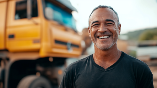 50 years old brazilian men smiling standing looking forward at a camera, full body, playing soccer, wearing black shirt, background of Mercedes-Benz trucks on city parking--ar 16:9 --ar 16:9