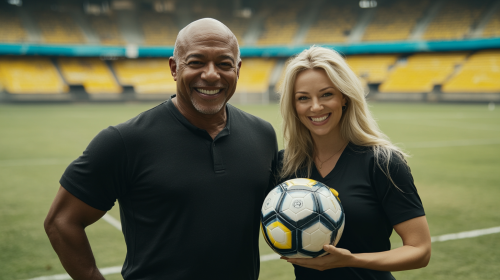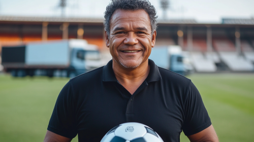 50 years old brazilian man smiling standing looking forward at a camera, holding a soccer ball, wearing black shirt, background of Mercedes-Benz trucks on a soccer stadium --ar 16:9