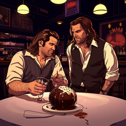 a british male 40 year old with brown hair next to a male with long hair and chubby complection 30 years old at a five star dining establishment enjoying a chocolate lava cake sphere in the style of grand theft auto --v 6.0