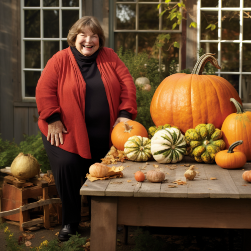 Ina Garten Barefoot Contessa laughs and stands next to a pumpkin that is five times her size in the garden.