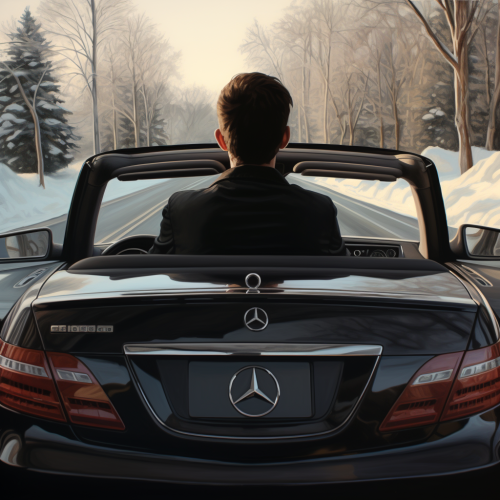 back of the head realistic shot of a man in his early 30s driving a convertible Mercedes-Benz E-Class Cabriolet (2010 - 2013) in the winter