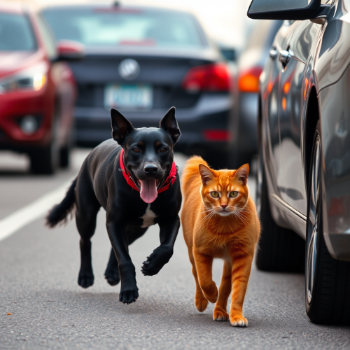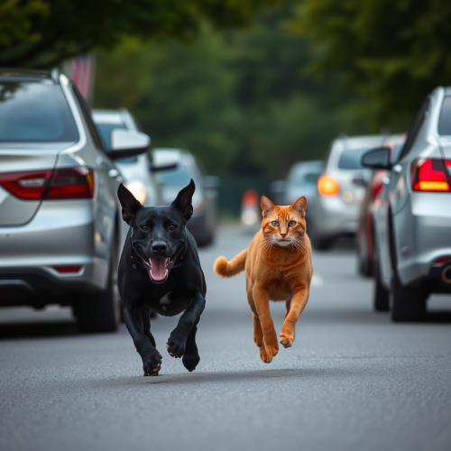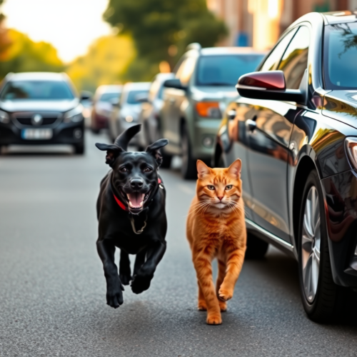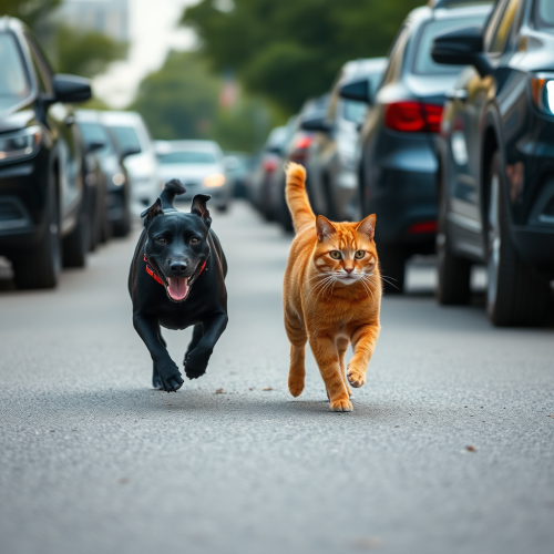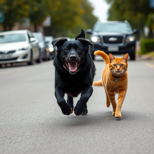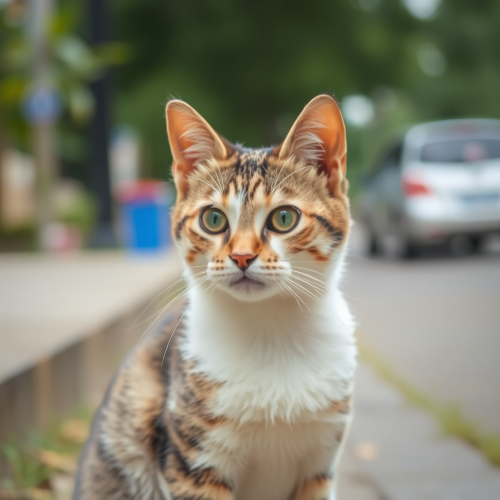 A sleek cat in a light blazer and tailored pants, short black fur, standing confidently on a vibrant street with colorful Venezuelan buildings, modern office style, professional look, warm lighting --v 5.0 --ar 1:1