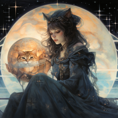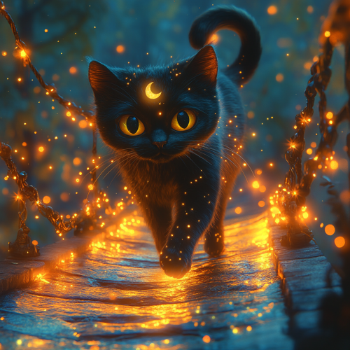 A majestic black cat with a crescent moon on its forehead, walking gracefully on a glowing bridge of stars, full body, 3D, Pixar style, cartoon. --s 750
