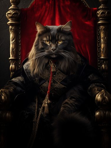 a slender black cat sitting in a royal throne wearing raiment --ar 3:4