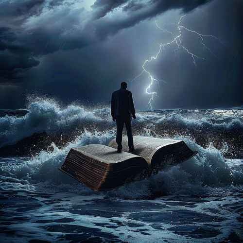 Man standing on giant bible floating in ocean, photo, nighttime, rough seas, angry lightning in sky, crashing waves