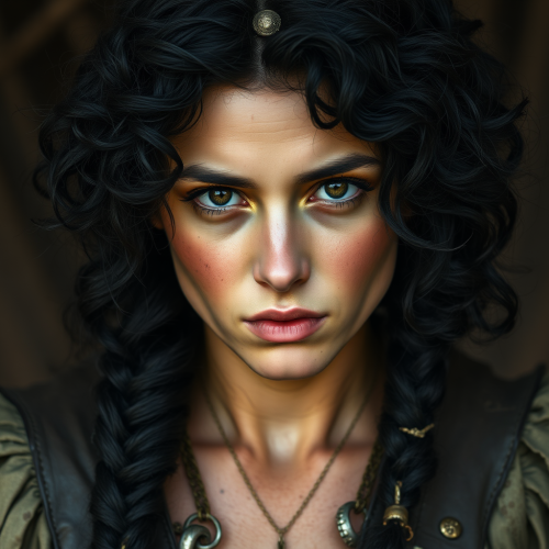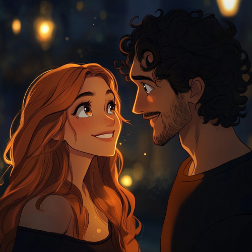 a woman with long orangy brown hair, hazel eyes, and long eyelashes standing looking at a man with curly black hair, brown eyes, and facial hair. They are smiling. Studio Ghibli anime art style, night time, fantasy.