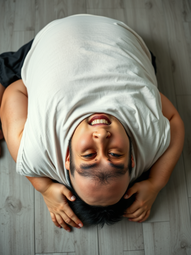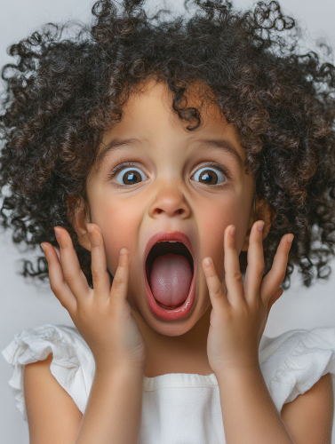 hyper realistic photo a 3 year old girl with very short curly hair makes a face by spreading her mouth wide to the sides with her fingers and sticking out her tongue. --ar 3:4