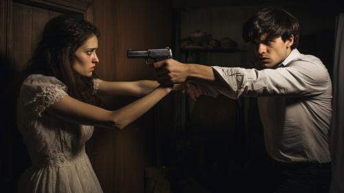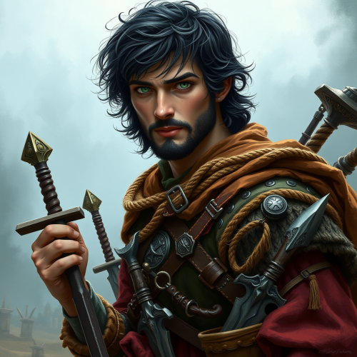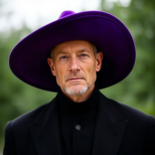 realistic front view of a black haired and beared 40 years old man, wearing a suit, half of his face could seen, looking to a deep forest deep from a high mountain