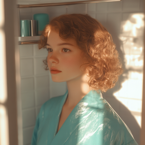 A slightly blurry European girl with curly light brown hair, standing in a bathroom, wearing a turquoise robe. The bathroom shelf contains two visible products. The scene is lit with natural bathroom light, and the focus is soft, emphasizing the blurred effect. Photorealistic, with attention to detail in hair texture and robe fabric.