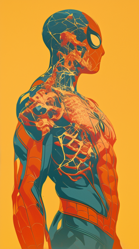 spider man tom holland, male, marvel,an intaglio print in cerulean blue transparent skin male masculine muscular model with , partial overlay with a drawing of a skeleton in scarlet red intaglio print, yellow accents, intaglio dotted texture, art editorial, solid color studio background, printmaking, fine art print, half body shot, flat studio background, 4k,fantasy concept, folklore details, hyper-detailed --niji 6 --ar 9:16