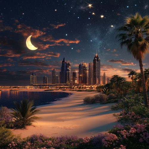 What Abu Dhabi looks like, fascinating, 2024s, imaginative, realistic, photographic of the city of Abu Dhabi, background Abu Dhabi city view and desert view, incredible, creative, sea 3d render, city lights, nowadays a day, night, half moon, star, summer spring flowers