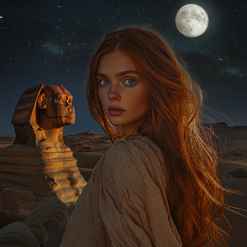 Photorealistic woman wrapped in linen with auburn hair, incredibly tan, with piercing blue eyes, standing in front of a sandstone sphinx in the desert at night with a sky full of stars and a full moon shining down