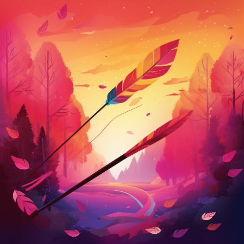 a bow and a single arrow background autumn leaves aurora borealis red pink yellow --v 5.0