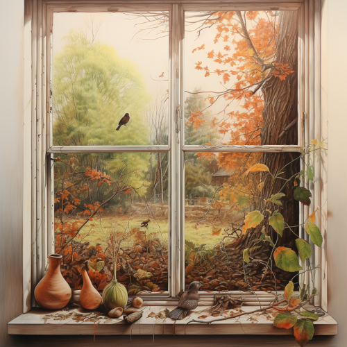 pencil art, in one window - autumn colors, in second window - green nature --v 5.2