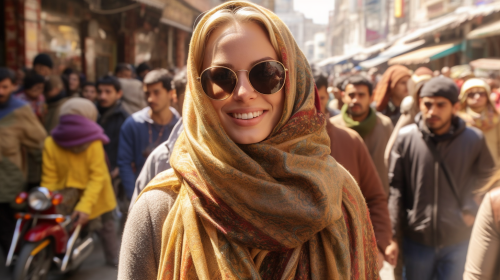 A cultural fusion in shiraz city, Iran, 2023. margot robbie, gracefully strides through a traditional Iranian market. She's adorned in a stylish Iranian scarf and coat, a nod to the 2023 fashion evolution in Iran. The surrounding crowd, men and women alike, are in contemporary Iranian attire, reflecting the style of 2023. The scene is a blend of tradition and modernity. Medium: Photography. Style: Ultra-detailed, evoking the feeling of a high-end fashion magazine spread. Lighting: Golden hour glow, illuminating the subjects and highlighting the textures of the fabrics. Colors: A palette of warm golds, deep browns, and vibrant market colors. Composition: Captured with a Nikon D6, using a NIKKOR Z 50mm f/1.8 S lens. The main subject is in sharp focus, with a bokeh effect on the background, giving a sense of depth and movement. ISO set to 120, shutter speed at 1/100, and aperture at f/7.1. --ar 16:9 --v 5.1 --style raw --s 750