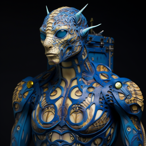 A blue dragonborn, with green eyes, strong jaw, stern face, working as an invetor in a workshop, 4k