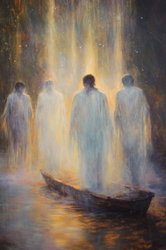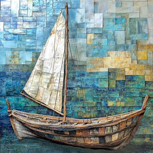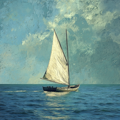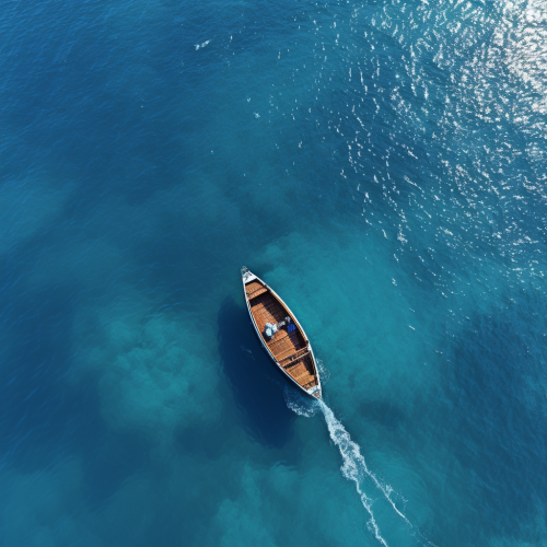 in the style of dreamy, romanticized , translucent water, majestic composition, liquid light emulsionsurreal, galaxy. A man is sitting meditating on a boat, with the ocean in the background, majestic composition, liquid light emulsion, --personalize txe2hpx --ar 3:2