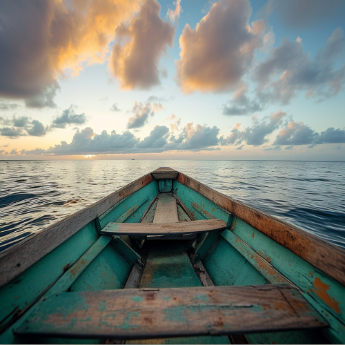 POV in a small old wooden boat floating in caribbean waters at dawn --v 6.0