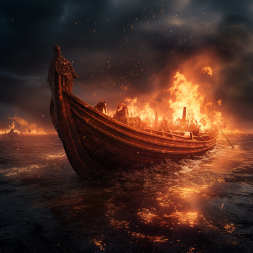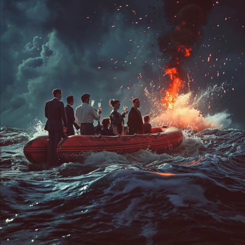 realistic picture of 10 people in formal clothes, calm, some with champagne glass on an inflatable rescue boat in high sea, with a burning drowning cruise boat in the backyard and a firework above. Dramatic mood. --v 6.0
