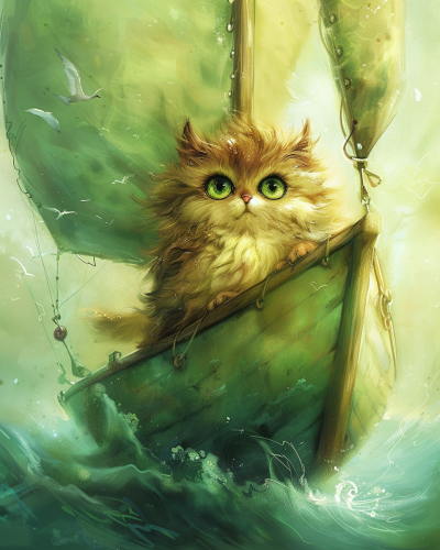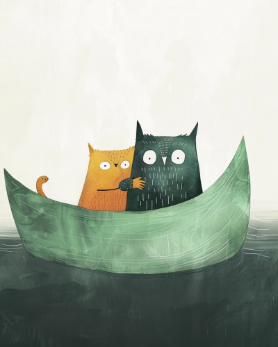 space for text, very cute owl and the cat, went to sea In a beautiful pea-green boat, pixar --style raw --ar 4:5 --v 6.0