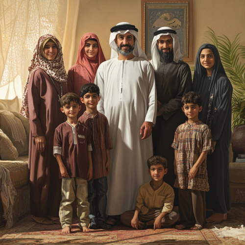 an Arab family gathering from gulf in a living room, seven sons and three adult daughters standing next to their father happily and a boy with 10 years is playing in the front realistic picture style