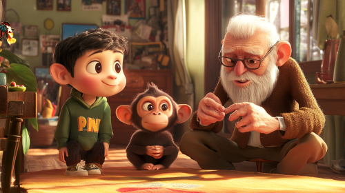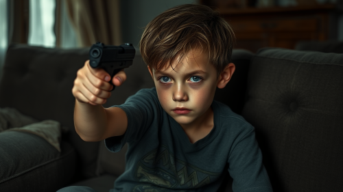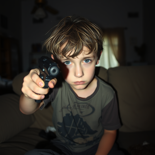 A tense confrontation between a boy in his 12 years and a man in his 30s in a cozy, well-lit living room setting. The scene is captured in a hyper realistic style, showcasing intricate details. The boy is wearing a dark denim jacket over a checkered shirt, while the second man is in a olive green shirt and black pant, gesturing expressively. The background features warm, earthy tones with wooden beams and a softly glowing window draped with light curtains. Subtle shadows create depth, emphasizing their intense expressions and body language. The overall atmosphere conveys a mix of emotion and drama, with a focus on the dynamic interaction between the two persons. --ar 16:9