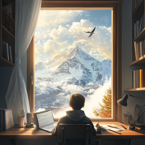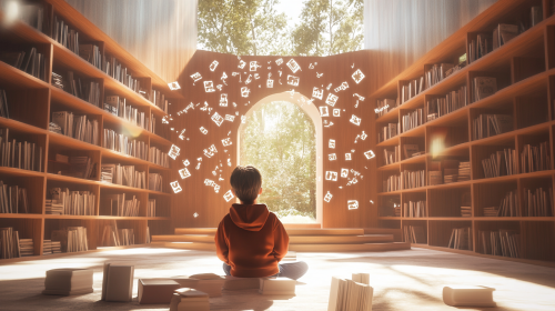 a boy sitting in a reading setting with all the wisdom of the world flowing into his mind. the wisdom is represented in different languages and as numbers and text. Interior scene with a dynamically balanced compostion of a higher education-inspired literacy center in New Mexico, with an emphasis on how literacy opens doors to new opportunities. The design is modern yet warm, featuring earthy tones, wooden shelves lined with books, and large windows that fill the space with natural light. Floating letters, numbers, and subtle educational symbols gently move around the room centralized over a stairway made of books that leads to the open door of opportunity, the door opens into a bright environment evoking a sense of intellectual growth without being overly fantastical. Doorways, arches, or pathways leading from bookshelves symbolize the idea that reading unlocks new journeys. The five pillars of literacy--phonemic awareness, phonics, fluency, vocabulary, and comprehension--are reflected through thoughtful design choices, such as study areas and quiet reading nooks. The atmosphere is inspiring and inviting, filled with the energy of discovery while maintaining a grounded, academic feel. in the style of the reading rainbow --aspect 16:9