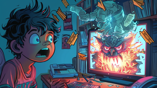 A playful comic panel where an Indian teenage boy, mid-game, looks surprised but amused as a silly SAT monster, made of crumpled tests and notebooks, emerges from his TV. Number 2 pencils hover around in a chaotic but humorous scene. The room is brightly lit, with colorful posters and gaming gear. Fun, vibrant comic style, light colors, cheerful atmosphere, hd quality --ar 16:9 --v 6.0
