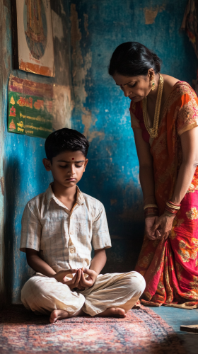 7 year old indian boy meditating in his room in a village her mother standing right side of the room and scolding the boy. Her mother is angry --v 6.1 --ar 9:16