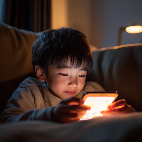 A 12-year-old Japanese boy looking at his phone and touching an app with a smile. He is lying on the sofa in the living room looking at his phone. His face is slightly illuminated by the light from the couch.