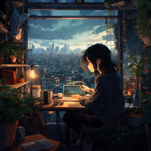 japanese anime style, girl programming on her computer. dark hair, view over the city from large window behind her, lots of cute plants in the room
