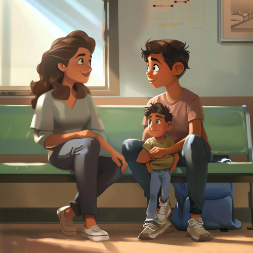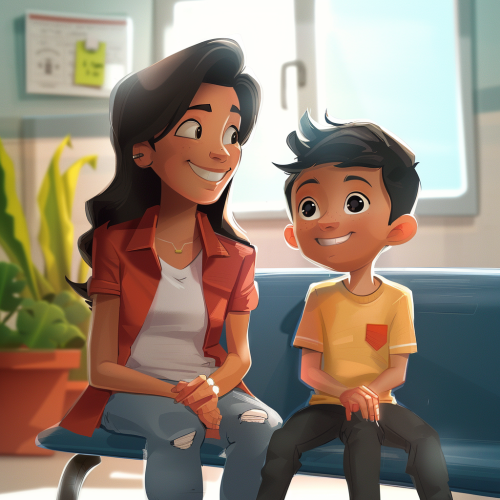 cartoon image of happy latino boy with his mom waiting in waiting room pixar style