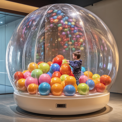 "A massive gumball machine installation with a transparent inflatable dome, featuring visible seams and realistic details of the inflatable plastic material. Inside the dome, there are only a few large, colorful balls mimicking gumballs, arranged in a natural, spread-out formation with plenty of space. A child is playing joyfully among the balls inside the dome, interacting with them in a playful and energetic way. The base of the machine resembles an Amazon Echo Dot (5th generation), with smooth, rounded edges and a modern design. The overall structure blends playful and futuristic aesthetics in a highly detailed, photorealistic style, with realistic lighting and textures.