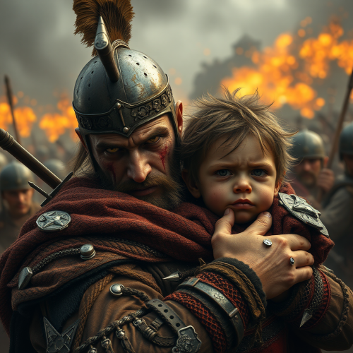 The British bombardment of Jhansi Fort, with Lakshmi Bai bravely defending her fortress, arrows and cannon fire in the background, and her child securely fastened to her back. hyperrealistic, cinematic, 8k