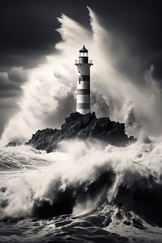 black and white photography of a lighthouse standing on a rock, on which waves are splashing during storm. High contrast. --ar 2:3