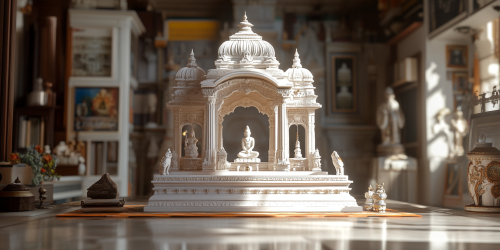 An ultra realistic photograph of a tiny and white jain temple structure kept inside the house. The image was captured using a Canon EOS R5 with 50mm --ar 2:1