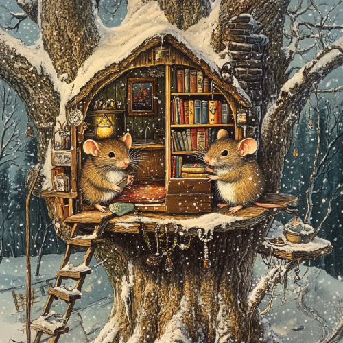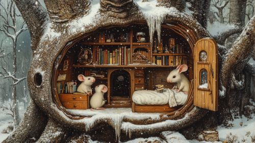 detailed 70s illustration of two mice living inside of a house that is inside a tree. inside the house there are books, a cozy bed, a kitchen. outside of the house it's snowing