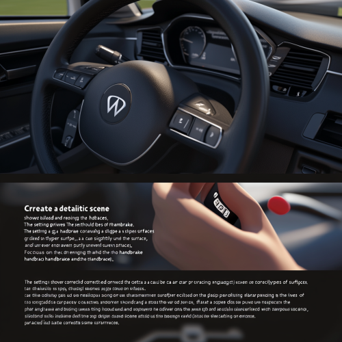 "Create a detailed and realistic scene showing a driver correctly using the handbrake. The setting should be a car parked on various types of surfaces (e.g., flat ground, a slope, and a slightly uneven surface). Focus on the driver engaging the handbrake and ensure the vehicle is securely parked. Include clear visual elements indicating the handbrake lever and its usage, with a caption explaining that the handbrake should always be used when parking, regardless of the surface."