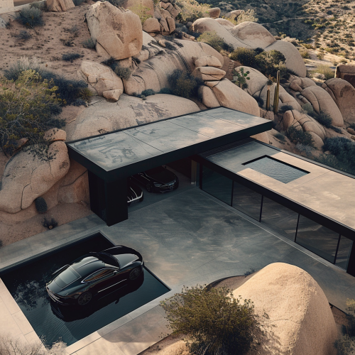 an underground garage with a all black G-Wagon in a black house with dark lighting with black clouds, in the style of virtual and augmented reality, light and dark black, modern and sleek, located in a large open bordered area, animated gifs, sabattier filter, iconic works of design, black lighting shining from the floor up to the modern house, at night