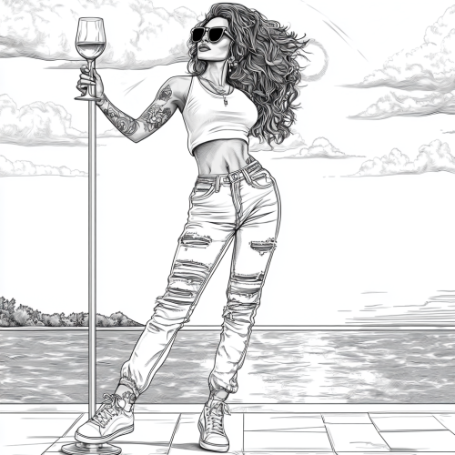 woman holding a glass of wine in her hand, dancing on a pole Pool Dance, has curls, stylish sunglasses, tattoos, a top, on her feet sneakers, long jeans, in the background a view of the sea and a sunset, vector graphics, black and white, white background, only an outline