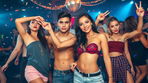 Young girls and guys are dancing at a disco party, having fun and smiling. Cinematic lighting. Super realistic. Taken on a cine camera with a 35mm lens. --ar 7:3 --s 50