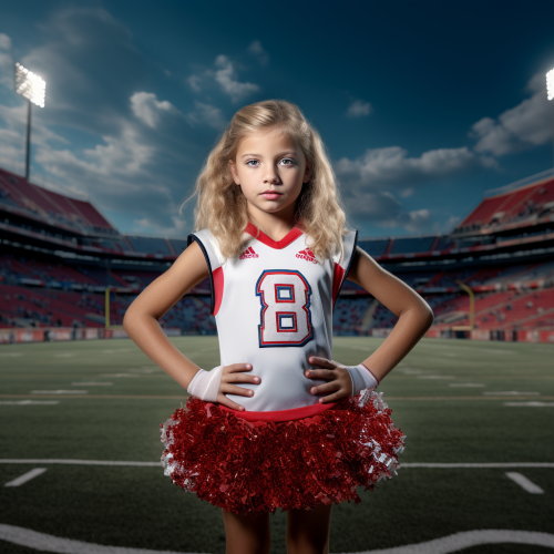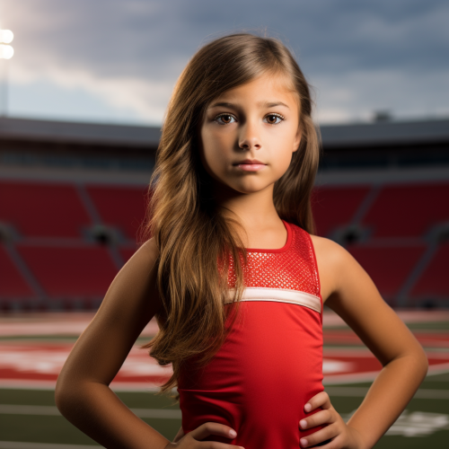 an 8 year old cheerleader, on an American football field with a stadium above behind her to the right, shot at 21mm with a fill flash in front
