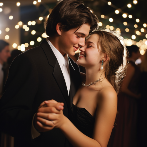 A 14 year old girl is wearing a black dress and dancing at a ball with a 14 year old boy in a suit