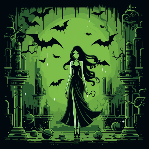 Green monocrome pixel art, vampire woman in a black dress in the style of nintendo game boy, full body, high heel shoes, open mouth, fangs, medieval, fantasy, halloween, black phantoms, ghosts, bats, jack-o-lantern, spooky, macabre, in the style of nintendo game boy graphics, game boy, 1990's, retro, pixel art, pixels, video game, 8-bit, green, green monochrome,