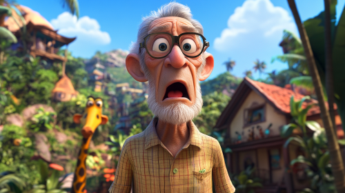 With a wave of his hand Grandpa makes the jungle animals and giant dessert disappear in a puff of smoke restoring the house to its original state ultra-realistic animated. --ar 16:9