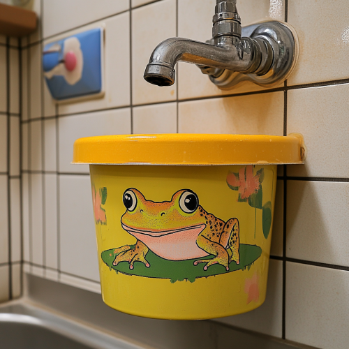 Realistic photo. Close-up of the washing area at the public bathhouse. There is a yellow bucket under the faucet. The bucket has an illustration of a frog on it.japan
