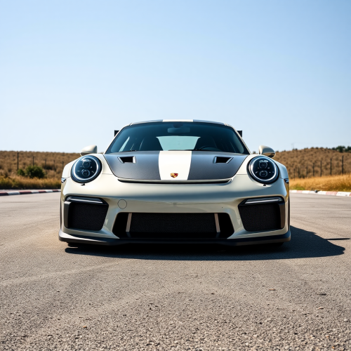 Close-up front view of an 8-level classical design building, 22 meters wide, with a penthouse on the top floor. The ground floor has plants on the left and a car entrance road on the right. Each floor has 2 residential units, with two classic balconies extending from the facade. The penthouse features plants on its terrace. Include both sides of the neighboring buildings in the scene.